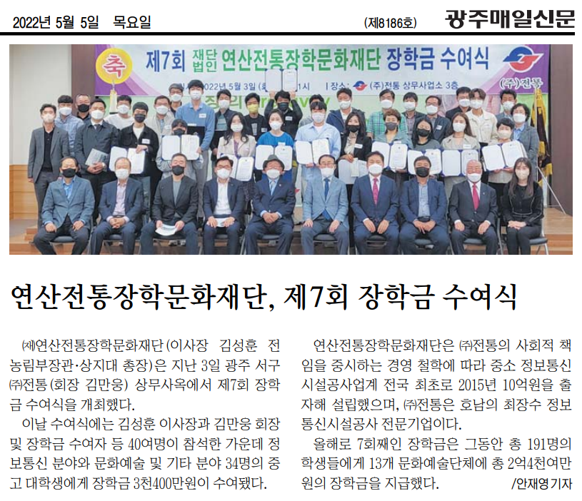 2022. 05. 06_광주매일신문_(재)연산전통장학문화재단 제7회 장학금 수여식